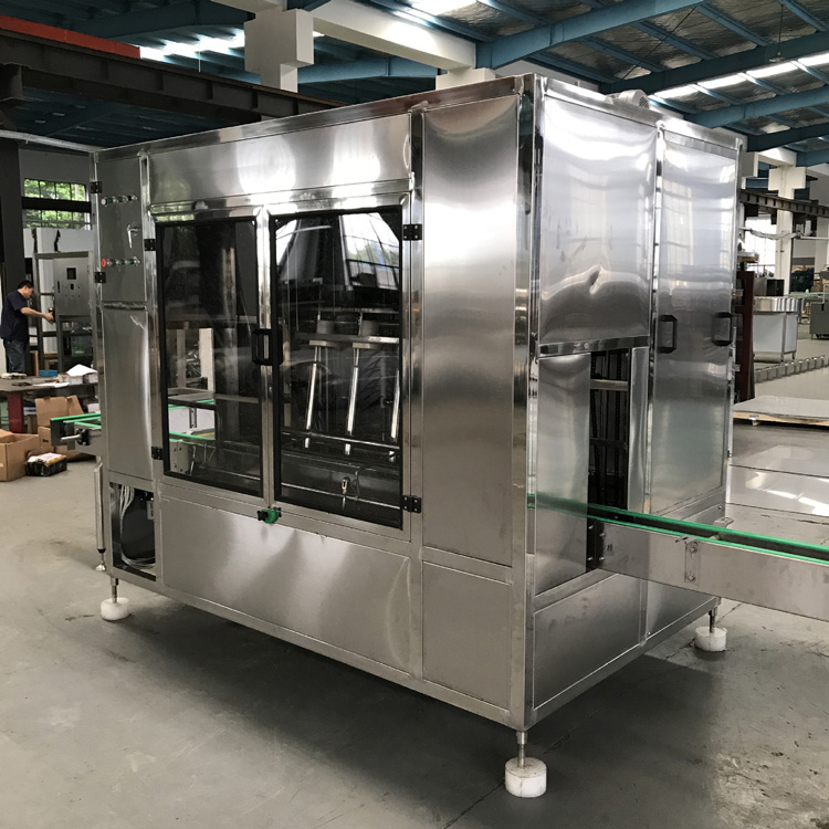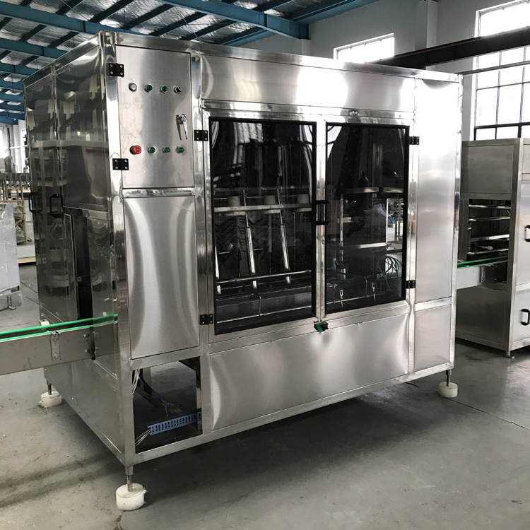 本灌裝生產(chǎn)線專用于3-5加侖桶裝水的灌裝,型號包括了QGF-100,QGF-240,QGF-300,QGF-450,QGF-600,QGF-900,QGF-1200。合消毒、沖洗、灌裝、壓蓋四為一體。沖洗機(jī)采用了多種洗液以及消毒液對瓶子進(jìn)行清洗以及消毒,消毒液能夠循環(huán)使用。瓶蓋會在清洗和消毒后運(yùn)至旋蓋機(jī)自動進(jìn)行旋蓋。本產(chǎn)品功能齊全,涵蓋了清洗、消毒、灌裝、旋蓋、計數(shù)等功能,高度自動化,實(shí)為飲料生產(chǎn)廠家理想的優(yōu)選設(shè)備。